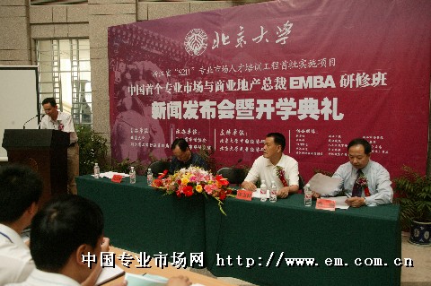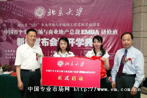 2006年6月23日至24日,我省60余名专业市场老总包机到北京,参加国内首个专业市场与商业地产北京大学EMBA总裁班学习。该研修班由北京大学民营经济研究院和我省市场协会共同主办,是我省“5211”专业市场人才培训工程启动的首批实施项目。
